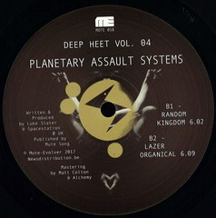 This new set of four highly concentrated cuts shows how effective Planetary Assault Systems can be at fueling the imagination by fusing together rhythmic and incidental elements into a unified, animated meshwork, without even a prominent melody to help out. Deep Heet Vol. 4 also showcases Slaters aptitude for choosing just the right moments to deviate from a steady groove.Since 2006, the Deep Heet series of recordings has shown the public an especially distinctive side of the production work of Planetary Assault Systems. With a unique 'engine room' ambience and a focus upon maintaining a continual surge of pure energy, each volume in the Deep Heet collection has lived up to that title, subtly suggesting the kind of sustained and voluntary temperature rise that has traditionally given way to spiritual or visionary experiences. Just check out tracks such as “Flat Tire“ from Volume 3, with its hard percussive edge accompanied by a pervasive hiss like boiling matter changing into gas. P.A.S. helmsman Luke Slater also thinks highly enough of this series to re-work tracks like “Whistle Viper“ in recent live sets, or to offer up others (e.g. “Raid“) for remixing by Mote-Evolver allies.It's only appropriate, then, that the 50th overall release on Mote-Evolver should also be the fourth overall volume of Deep Heet. In keeping with Slater's recent forward-thinking self-assessments like the “Planetary Funk“ anniversary series, this is simultaneously a summary of past successes and another new evolution in style and content. This new set of four highly concentrated cuts shows how effective Planetary Assault Systems can be at fueling the imagination by fusing together rhythmic and incidental elements into a unified, animated meshwork, without even a prominent melody to help out. For example, on the compelling track “Lazer Organical,“ listeners will find themselves in the midst of a testing range where thick arcs of coherent plasma ricochet off of the walls. Deep Heet Vol. 4 also showcases Slater's aptitude for choosing just the right moments to deviate from a steady groove: on the mesmerizing bubblebath of “Random Kingdom,“ he allows listeners to sink into the rising sonic foam before interjecting with some sharp metallic hits. The leadoff track “Desert Races“ proceeds in similar fashion, weaving a web of luminous sequencer patterns around the listener before and cutting in with sudden fluctuations or distortions that function like a hypnotist's suggestions after an entranced patient has become fully responsive. “Life Rhythm,“ on the other hand, is a total immersion session in which Slater's presence seems to recede into the background and listeners themselves may begin imagining overtones and sonic ephemera that weren't programmed into the original track.Charted by Psyk, Edit-Select, Jeff Derringer, Hudi, Paula Temple, Inigo Kennedy, Thomas Hessler.