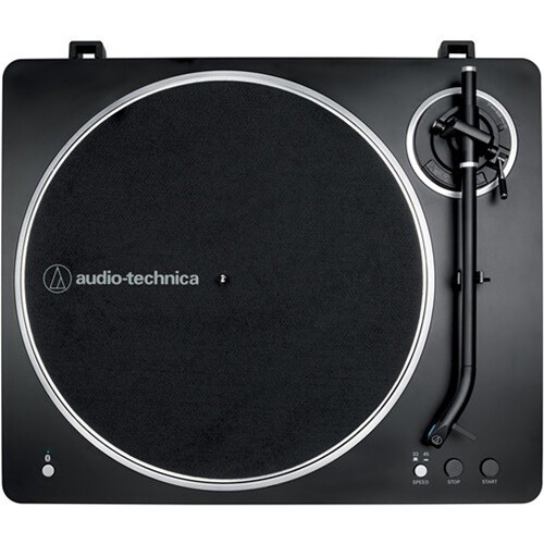 An improved three-piece chassis helps to reduce mechanical resonance and a J-shaped tonearm improves needle tracking. Integrated AT-VM95 moving magnet cylindrical needle. The AT-LP70XBT reproduces both 33-1/3 and 45 rpm recordings. In addition to wireless Bluetooth with aptX, it features a built-in switchable phono amplifier that can be connected directly to home stereos, powered speakers and other components, whether they have a dedicated phono input or not.