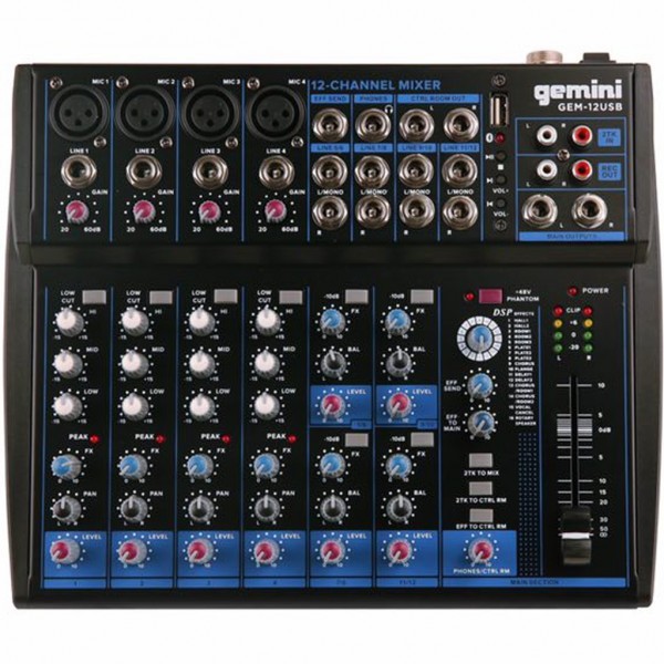 mixer audio a 12 canali – gain, alti, medi, bassi, clip led, pan, mandata effetti con volume e master sui canali 1/2/3/4 – balance, mandata effetti e master su tutti gli altri canali – Time Delay sull'uscita master con regolazione dell'effetto dry/wet e dsp interno con 99 effetti tra cui reverbero, delay, modulator, pitch e multieffect – porta USB per suonare file audio direttamente da una memoria USB – ricevitore Bluetooth – uscite ed ingressi bilanciati e sbilanciati – tape in/tape out – doppia alimentazione Phantom 48 V – fx send – doppio bus – uscita cuffia – master cuffia e master generale – questo mixer mic/line a 2 bus con design ULN dalla bassissima interferenza, offre tutto ciò che occorre per il missaggio professionale