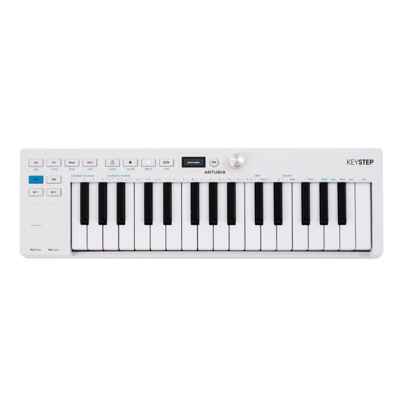 L’Arturia KeyStep mk2 è un controller e sequencer compatto progettato per diventare il cuore di ogni setup ibrido, unendo strumenti analogici, digitali e software in un flusso creativo continuo. Con la sua tastiera Slimkey a 32 tasti sensibili alla dinamica e all’aftertouch, funzioni di sequencing avanzate e un’ampia connettività, è pensato per musicisti, produttori e performer che desiderano creare, improvvisare e controllare l’intero sistema musicale da un’unica interfaccia. Il KeyStep mk2 non è solo una tastiera, ma anche un sequencer polifonico, un arpeggiatore e un controller universale in grado di pilotare qualsiasi strumento. Il display OLED e l’encoder a pressione rendono ogni operazione immediata, mentre i controlli dedicati per Mutate, Spice e Dice permettono di generare variazioni musicali creative in tempo reale, trasformando semplici idee in strutture sempre nuove e dinamiche. Grazie alla modalità sequencer, è possibile registrare o programmare sequenze fino a 64 step con 8 note di polifonia, collegare pattern, sovraincidere note e modulazioni e modificare le sequenze dal vivo. In modalità arpeggiatore, si può scegliere tra 16 tipi di arpeggio, da quelli classici a quelli più sperimentali, con la possibilità di rimappare le sequenze alle note suonate per ottenere risultati sempre musicali. In modalità controller, il KeyStep mk2 gestisce in modo fluido qualunque configurazione, fungendo da centro di comando per sintetizzatori, moduli CV, drum machine o DAW. La sua connettività estesa comprende uscite CV/Gate assegnabili per pitch, gate e modulazione, porte MIDI DIN a grandezza standard, Sync In/Out da 3,5 mm per sincronizzare strumenti vintage e ingressi TRS per pedali sustain o expression. Il collegamento USB-C garantisce compatibilità immediata con computer e dispositivi mobili, mentre l’alimentazione diretta via USB semplifica l’utilizzo in ogni contesto. Robusto, portatile e incredibilmente versatile, l’Arturia KeyStep mk2 è uno strumento essenziale per chi cerca un modo fluido, immediato e ispirato di trasformare le idee musicali in realtà, che si tratti di performance live, sessioni di studio o sperimentazione modulare.
